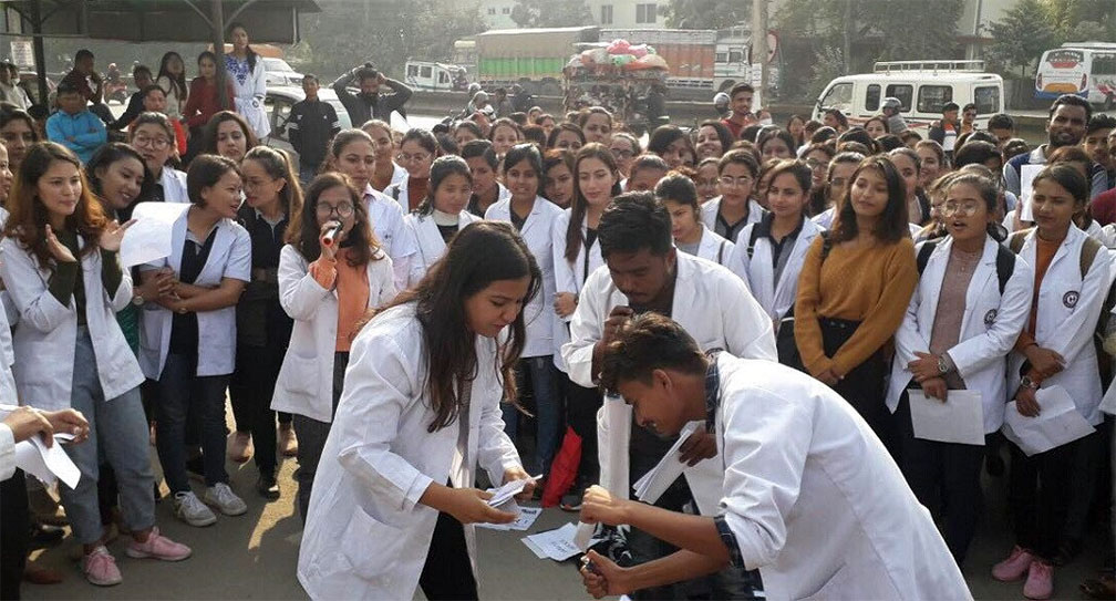 उनीहरुले बुधबार कलेजले बाँडेको परीक्षा प्रवेशपत्र लिएर सडकमा लगेर जलाउँदै परीक्षामा भाग नलिने घोषणा गरेका थिए । पाँच मेडिकल कलेजका विद्यार्थीहरुले एमबीबीएसको पहिलो वर्षको परीक्षा बहिस्कार गरेका छन् ।