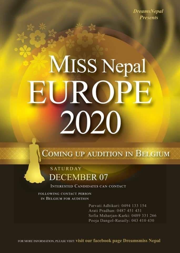 मिस नेपाल युरोपमा भाग लिने प्रतियोगीहरु छनोट गर्न अहिले सम्म फ्रान्स फिनल्यान्द् अस्ट्रिया, आयरल्यान्ड नर्वे, लगायतका देशहरुमा अडिशन सम्पन्न भै प्रतियोगी हरु छनोट भै सकेका छन भने बेल्जियम, लग्जेम्बर्ग, स्विटजरल्यान्ड नेदरल्यान्ड,जर्मनी लगायतका देशहरुमा अडिशन सकिए पछी जनवरी २६, २०२० मा बेल्जियममा मिस नेपाल युरोपको आयोजना गरिने ड्रिम्स् नेपाल बेल्जियमले जानकारी गराएको छ ।