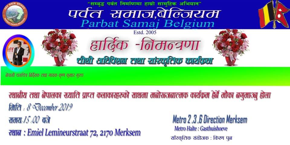 पर्बत् जन्मथलो भै बेल्जियममा बसोबास गरीरहेका नेपालीहरुले जिल्लाबासीको एकता र जन्मथलोमा परोपकारी काम गर्ने उद्यस्य सहित् गठन गरेको पर्बत् समाज बेल्जियमको चौथो अधिबेशन यही डिसेम्बर आठ तारिक आईतवार एन्तवेरपेनको मेर्कसेममा हुने भएकोछ ।