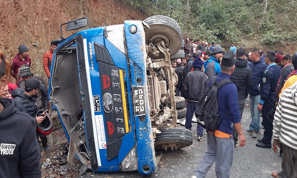 धादिङको प्रसिद्ध तीर्थस्थल ढोलामण्डलीको दर्शन गरेर फर्किएका तीर्थयात्री बोकेको ग १ ख ८०१२ नम्बरको मिनिट्रक सडकमै पल्टेको स्थानीयलाई उदृत गर्दै जिल्ला प्रशासन कार्यलयले जनाएको छ ।
