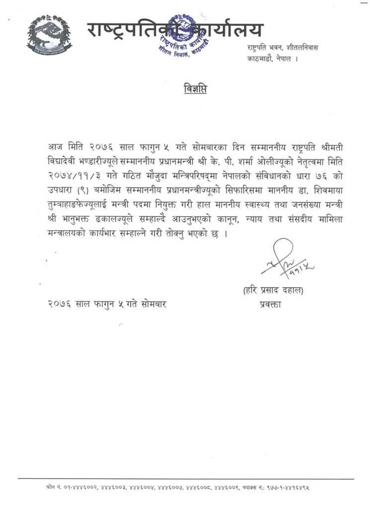 समाजवादी पार्टीका अध्यक्ष उपेन्द्र यावदले राजीनामा दिएपछि सो मन्त्रालय रिक्त रहेकोमा प्रधानमन्त्रीले स्वास्थ्य तथा जनसङ्ख्या मन्त्री भानुभक्त ढकाललाई कार्यभार दीईएको थियो ।