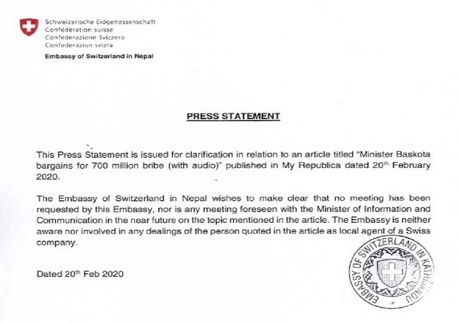 खरिद प्रकरणमा स्वीस कम्पनिले समेत प्रयास गरेको र कमिसनको प्रस्ताव मन्त्रीलाई राखेको अडियो टेप सार्वजनिक भएपछिको समाचारप्रति स्वीस दूतावासले धारणा सार्वजनिक गरेको हो ।