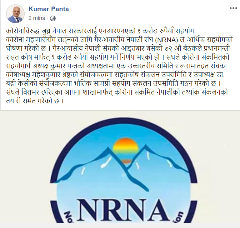 मन्त्रिपरिषदको आज (आइतबार) साँझ बसेको बैठकले शुरुमा सरकारको तर्फबाट ५० करोड रुपैयाँ राखेर कोष खडा गरेको थियो । अध्यक्ष पन्तले संघको निर्णय सार्वजनिक गर्दै फेशबुकमा लेखेका छन्,”संघले कोरोना संक्रमितको सहयोगार्थ अध्यक्ष कुमार पन्तको अध्यक्षतामा एक उच्चस्तरीय समिति र त्यसमातहत संघका कोषाध्यक्ष महेशकुमार श्रेष्ठको संयोजकत्वमा राहतकोष संकलन उपसमिति र उपाध्यक्ष डा। बद्री केसीको संयोजकत्वमा भौतिक सामग्री सहयोग संकलन उपसमिति गठन गरेको छ ।” त्यस्तै, संघले विश्वभर छरिएका आफ्ना शाखामार्फत् कोरोना संक्रमित नेपालीको तथ्यांक संकलनको तयारी समेत गरेको पन्तले जनाएका छन् ।