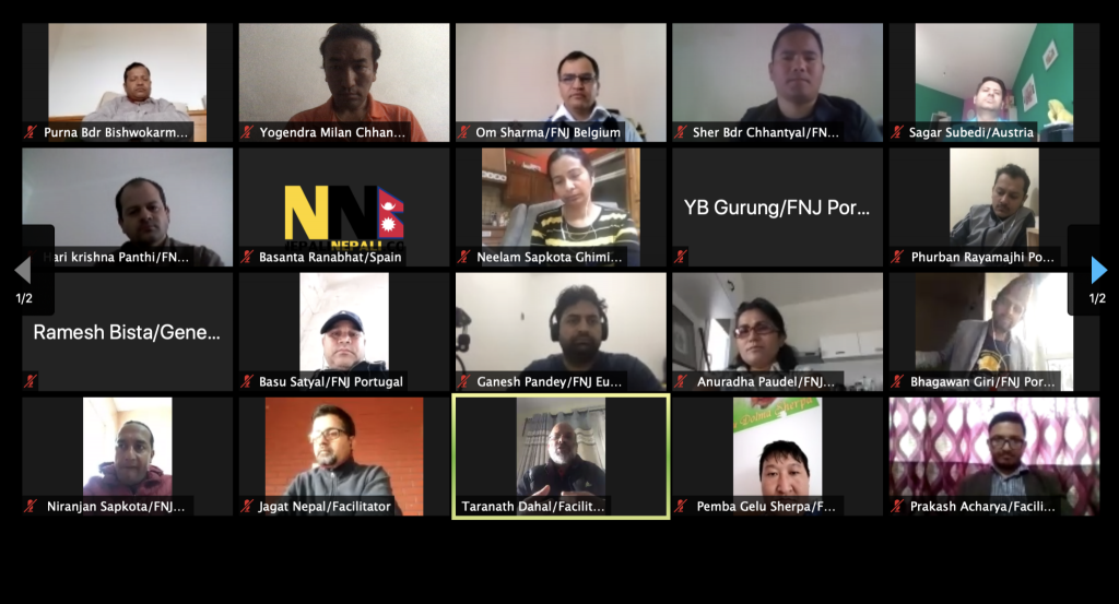बन्दाबन्दीका बेला नेपाल पत्रकार महासंघ बेल्जियम र पोर्तुगल शाखाले ‘प्रवासमा पत्रकारिता’ विषयक एक दिवसीय तालिमको आयोजना गरेका थिए । तालिमको सहजीकरण दाहाल, नेपाल र आचार्यले गरेका थिए । सोमबार सम्पन्न तालिम जुम एप प्रयोग गरेर सञ्चालन गरिएको थियो ।