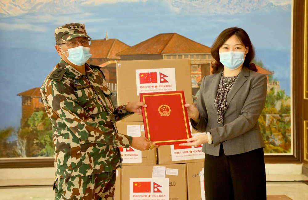 चीनले नेपाली सेनालाई कोभिड १९ को प्रतिकार्यका लागि नेपाली सेनाबाट तैनाथ गरिने स्वास्थ्यकर्मीहरुको सुरक्षार्थ आवश्यक पर्ने पिपिई, एन ९५ मास्क, कोरोनाभाइरसको परीक्षणमा प्रयोग हुने रसायन र अस्पतालका बेड, गगल्सलगायतका अन्य विभिन्न मेडिकल सामाग्रीहरु हस्तान्तरण गरेको सेनाले जनाएको छ । नेपाली सेनाका प्र्रवक्ता सहायकरथी विज्ञानदेव पाण्डेले ५ मिलियन युआन बरावरको स्वास्थ्य सामाग्री चीनले नेपाली सेनालाई हस्तारण गरेको जानकारी दिए ।