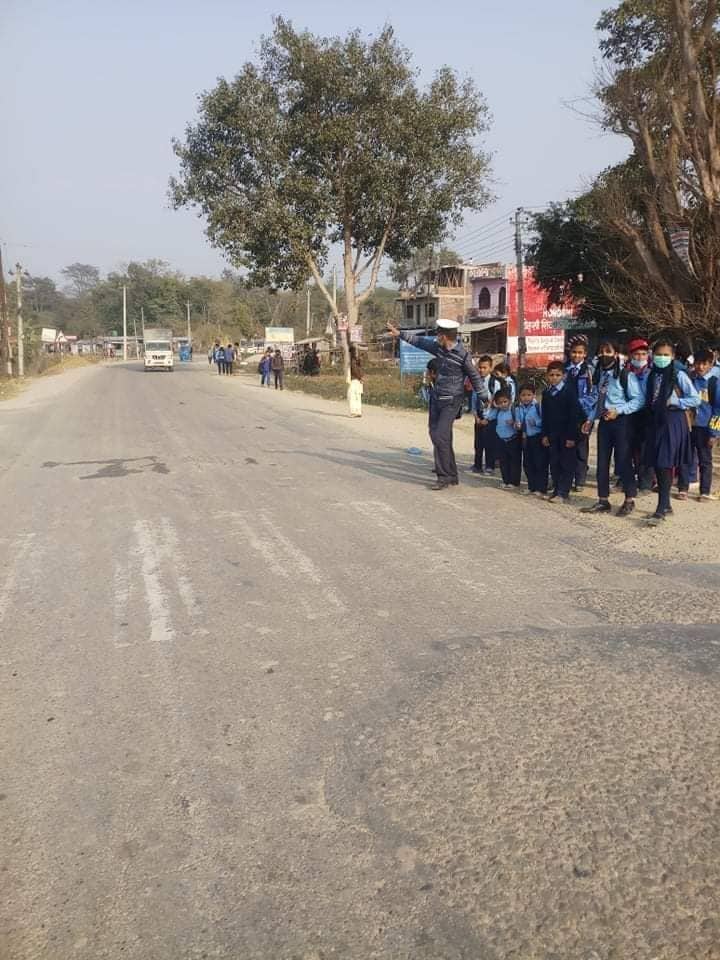 हप्तामा ३ दिन बिधालयमा गएर सचेतना कार्यक्रम गरिएको साथै बिधालय समयमा हाइवयमा हुइकिएर आउने गाडिहरुलाई रोकेर जेब्रा क्रसिङबाट विद्यार्थीहरुलाई बाटो काट्न मद्दत गरिरहेको दृश्य बिहान १० बजे देख्न सकिन्छ।
