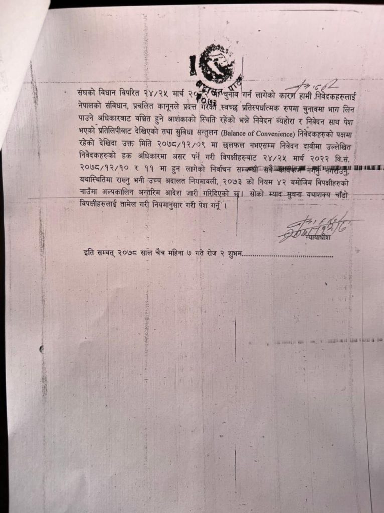 गैर आबासिय नेपाली संघका अध्यक्ष कुमार पन्त समुहले आयोजना गरेको निर्वाचन एबम महाधिबेशन स्थगित गर्न पाटन उच्च अदालतले अन्तरिम आदेश जारी गरेकोछ ।