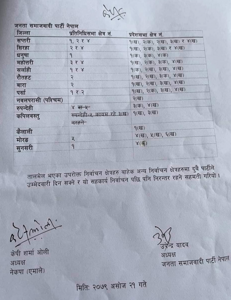 काठमाडौं : प्रमुख प्रतिपक्षी दल नेकपा (एमाले) र जनता समाजवादी पार्टी (जसपा)बीच चुनावमा गठबन्धन गर्ने सहमति भएको छ ।