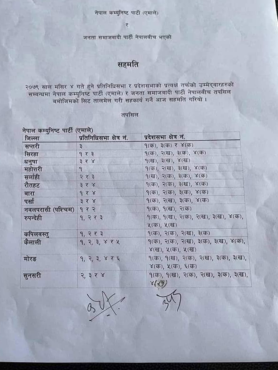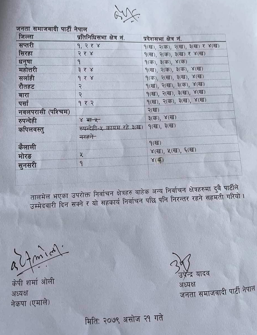 सहमतिअनुसार एमालेले जसपालाई प्रतिनिधिसभामा १७ सिट दिने भएको छ । त्यस्तै, प्रदेशसभामा ४२ सिट जसपाले पाएको छ ।
