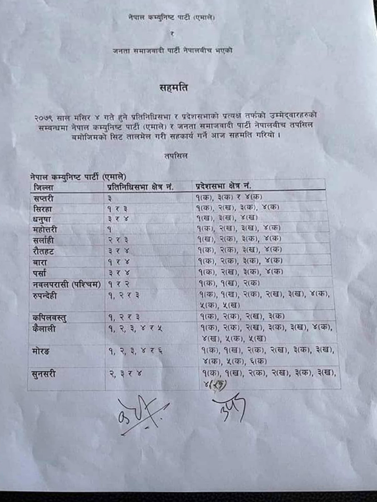 यसअनुसार यी जिल्लामा प्रतिनिधिसभाका ३५ सिट एमालेले लिनेछ भने जसपाले १७ सिट लिने भएको छ ।