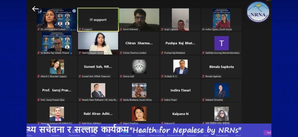 संघको यसिया प्यासिफिक क्षेत्रको ब्यबस्थापनमा भएको भर्चुयल कार्यक्रममा बर्तमान विश्वमा बढी रहेका अंानबिय गतिबिधिहरुबाट मानसिक र सारिरिक स्वास्थ्यलाई बचाउन ब्यक्तिले अबलम्बन गर्नु पर्ने बिषयहरुबारे जानकारी गराइएको थियो । बालापन बिताएको ठाउ र आफन्तबाट अलग हुँदा प्रबासी जीबनमा ब्यहोर्नु पर्ने रिक्तताले उत्पन गर्ने चुनौतिलाई सामना गर्नका लागि आबस्यक उपाय र नेपालमा एनआरएनए मार्फत गर्न सकिने स्वास्थ्य सचेतना र स्वास्थ्य सेवाका बारेमा कार्यक्रममा छलफल भएको थियो ।