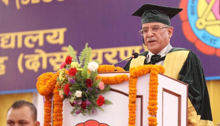 काठमाडौं \ प्रधानमन्त्री पुष्पकमल दाहाल ‘प्रचण्ड’ले विश्वविद्यालयको शिक्षा अनुसन्धान र नवप्रवर्तनमा केन्द्रित हुनुपर्ने बताउनु भएको छ। आइतबार दिउँसो धुलिखेलमा आयोजित काठमाडौं विश्वविद्यालयको २८ औं दीक्षान्त (दोस्रो चरण) समारोहमा बोल्दै प्रधानमन्त्रीले विश्वविद्यालयमा स्नातकोत्तर तहका पाठ्यक्रममा अनुसन्धान र नवप्रवर्तनलाई प्राथमिकता दिनुपर्ने र स्नातक तहमा बढी अभ्यासमुखी र सिकाइमा जोड दिनुपर्ने बताउनुभएको हो।