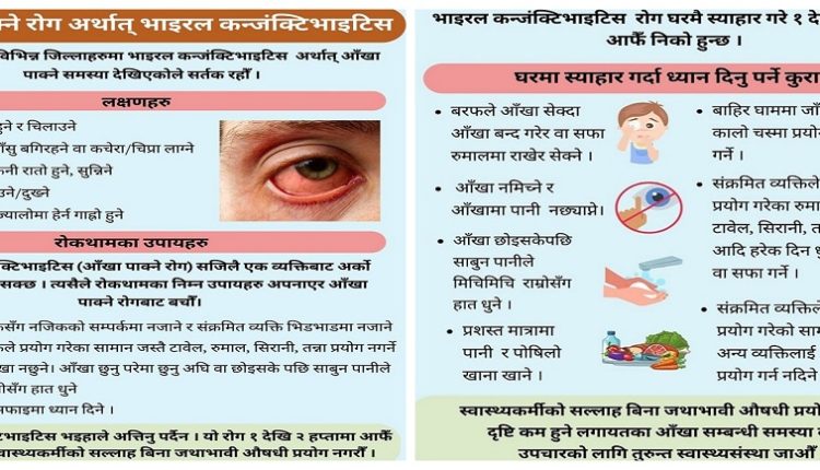 धेरै ठाउँमा प्रकोपको रुपमा सङ्क्रमण फैलिरहेकाले महामारी फैलिने खतरा रहेको भन्दै डाक्टरले सावधानी अपनाउन सुझाव दिएका छन् । नेपाल आँखा अस्पताल त्रिपुरेश्वरका वरिष्ठ नेत्र रोग विशेषज्ञ डाक्टर इन्दुप्रसाद ढुङ्गेलका अनुसार अहिले आँखामा देखिएको सङ्क्रमण सरुवा रोग हो । यो रोगबाट जोगिन हातले आँखा नछुन, बारम्बार हात धुन र सङ्क्रमित बिरामीबाट टाढै रहन डाक्टरको सुझाव छ ।