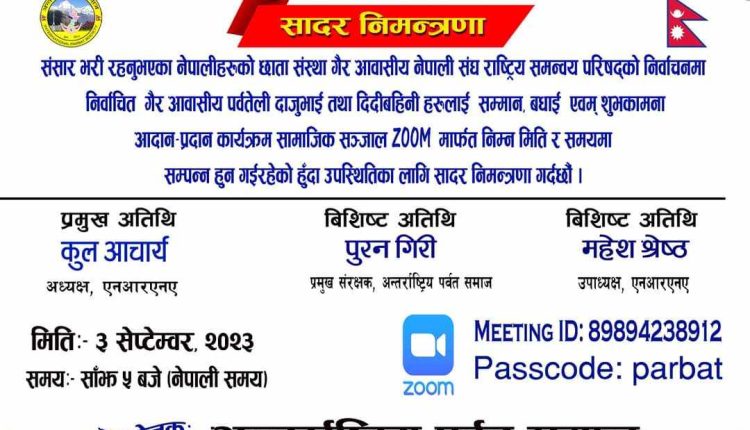 सेप्टेम्बर तीन तारिख हुने भर्चुयल बधाई तथा सम्मान कार्यक्रमलाई एनआरएनए अध्यक्ष कुल आचार्य, उपाध्यक्ष महेश श्रेष्ठ र समाजका प्रमुख संरक्षक पुरन गिरी लगायतले सम्बोधन गर्ने कार्यक्रम रहेकोछ ।