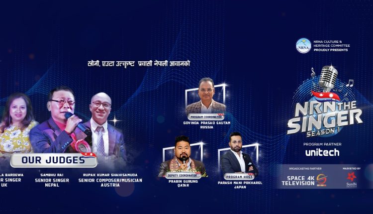 काठमाडौं । ‘खोजी एउटा उत्कृष्ट प्रवासी नेपाली आवाज’ को मूल मन्त्रका साथ ‘एनआरएन द सिङगर’ मंगलबारदेखि प्रसारण हुने भएको छ । गैरआवासीय नेपाली संघ (एनआरएनए) को संस्कृति तथा सम्पदा समितिको संयोजन र युनिटेक नेपालले व्यवस्थापनमा उत्पादन गरिएको कार्यक्रम मंगलबार राति १० बजेदेखि ‘स्पेस फोर के टेलिभिजन’ मा प्रसारण हुने छ ।