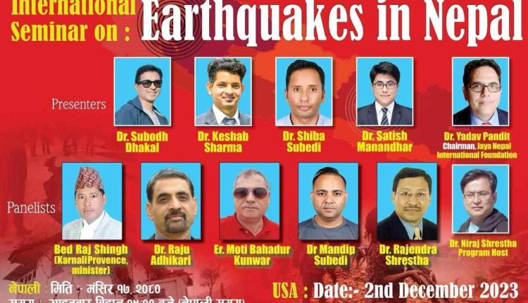 अमेरिका, २७ नोभेम्बर । जय नेपाल इन्टरनेशनल फाउन्डेसनले भुकम्प सँग बाच्ने तरिकाका बारेमा एक भर्चुयल सेमिनार आयोजना गरेकोछ । डिसेम्बर २, २०२३ (मङ्सिर १७ , २०८०) को नेपाली समय अनुसार बिहान ०९:०० बजे “लिबिंग विथ भूकम्प” नामक भर्चुअल सेमिनार हुने संस्थाले जनाएकोछ । भूकम्प सम्बन्धी सचेतना जगाउने उद्देश्यले संस्थाले कार्यक्रम गर्न लागेको संस्थाका अध्यक्ष डा. यादव पण्डितले बताउनु भएको छ ।