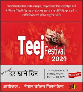 युरो नेपाल कलाकार संघले बिगत लामो समयबाट तीजमा बिशेस कार्यक्रम गरेर दर खाने र नेपाली बाजा गाजा सहित तीजको नाचगान गर्ने गरेकोछ । बेल्जियमका हरेक जसो नेपाली समुदायका कार्यक्रममा बाजा, गीत न्रित्य प्रस्तुत गरेर नेपाली कला संस्कृतिको प्रबर्धन गर्दै आएको ‘इना बेल्जियम’ ले यस बर्ष पनि लाइभ बाजा गाजा सहित नाचगानको कार्यक्रम अगस्त ३१ तारिख लुभेन केसलोमा आयोजना गरेकोछ । कार्यक्रममा स्थानीय नगरपालिका , नेपाली राजदुताबास र संघ संस्थाहरुको सहयोग रहने संस्थाका अध्यक्ष बलराम पुनले जानकारी गराउनु भएकोछ ।