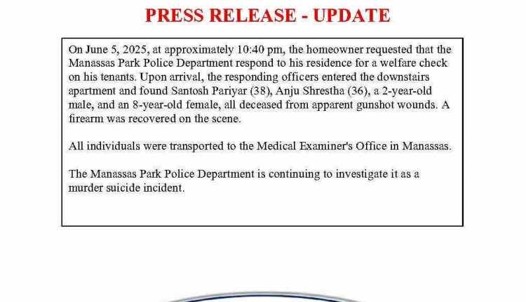 अमेरिकाको नेपाली समुदायलाई फेरी अर्को दुखद घटना आइलागेकोछ । गत बर्ष नेपाली नर्स ममता काफ्लेको हत्या भएकै शहर मनासास भर्जिनियामा दुई बालक सहित एकै परिवारका चार जना मृत फेला परेकाछन।