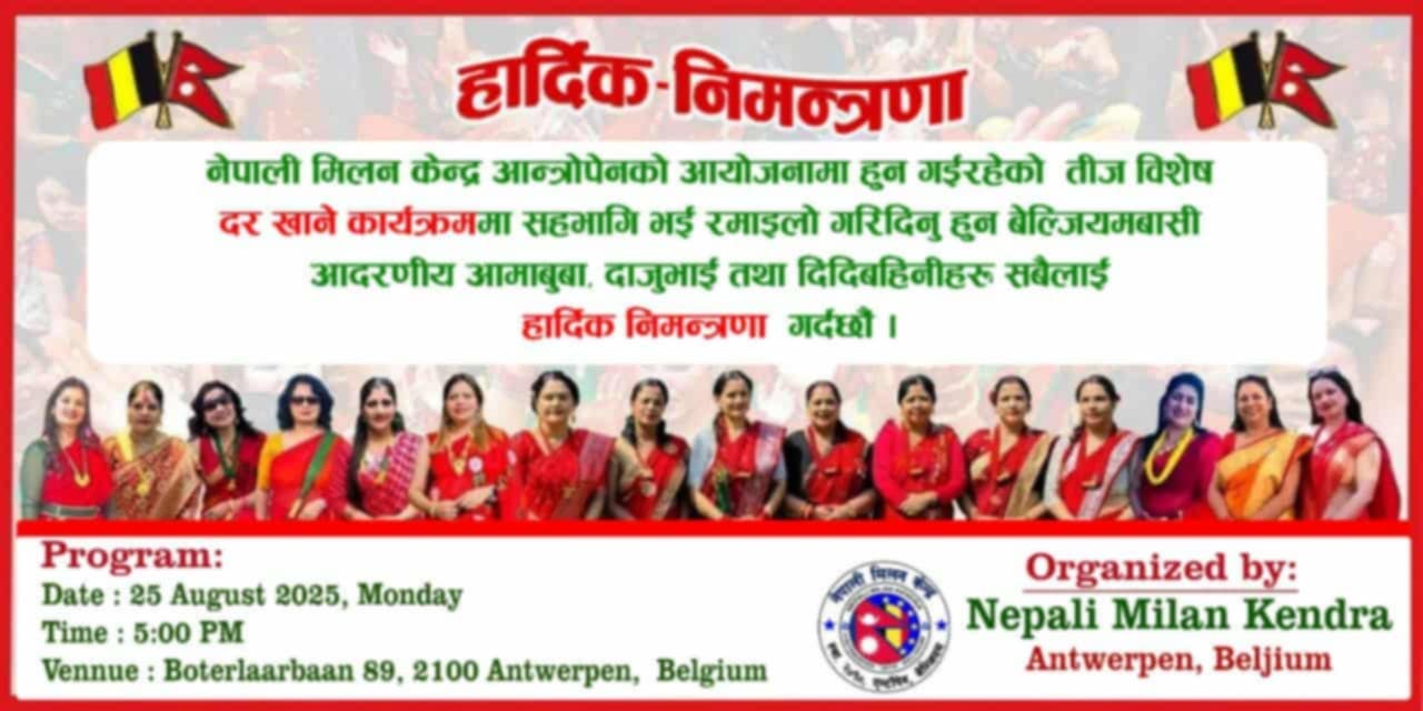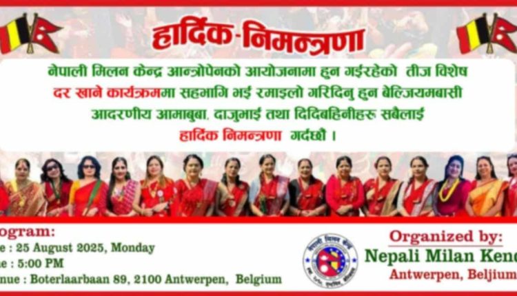नेपाली मिलन केन्द्र एन्तवेर्पेनले २५ अगस्तमा तीजको दर खुवाउने कार्यक्रम गर्दै, नेपाली बसोबास भएका अन्य सहरमा पनि तीज मनाइदै ,