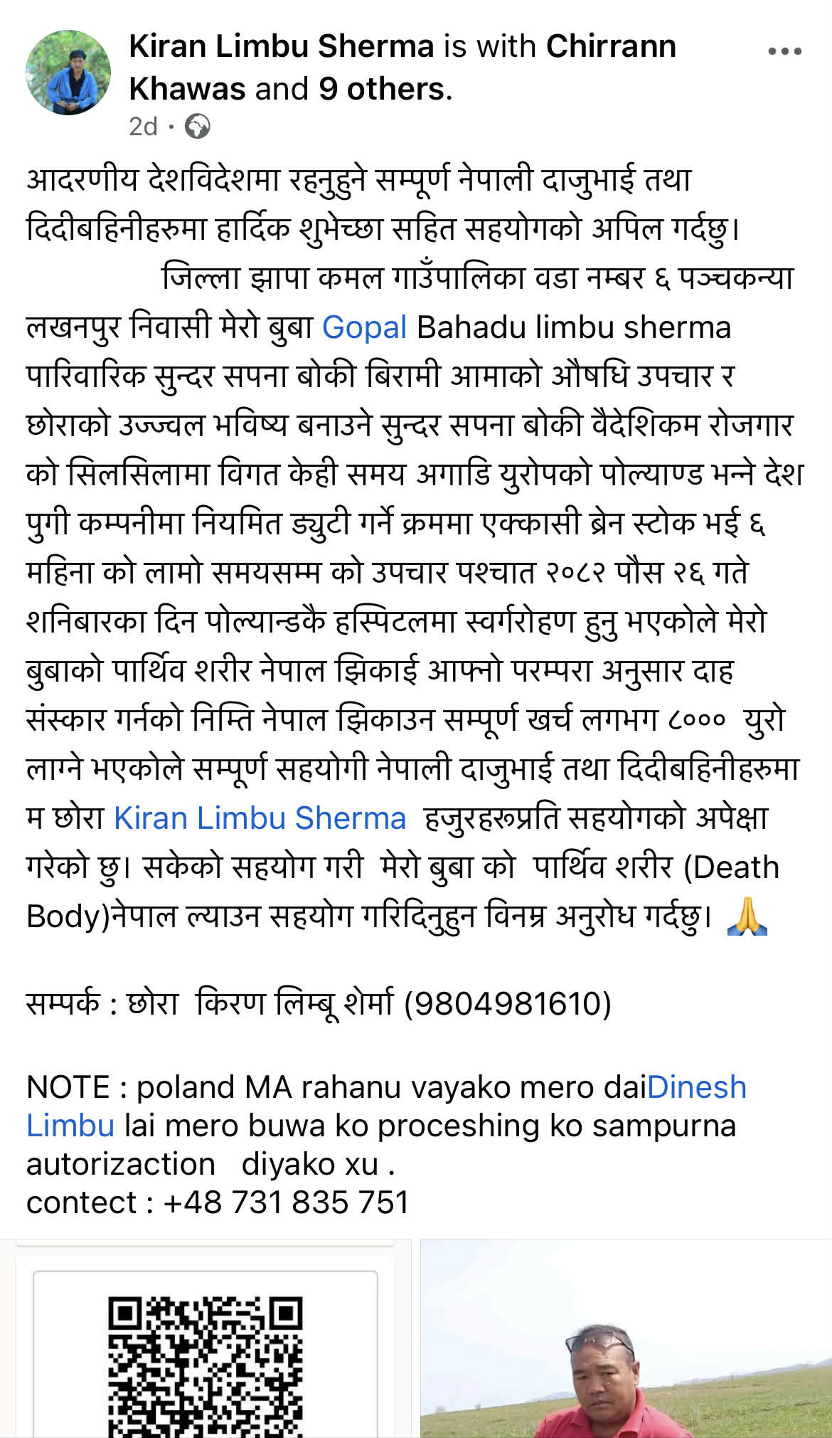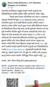 परिवारको आर्थिक अवस्था कमजोर भएको हुँदा उनको शब परिवारको खर्चमा नेपाल पुर्र्याउने अबस्था नभएकोले मानवीय संबेदनालाई हृदयगंम गरी युरोप लगायतका अन्य मुलुकमा बस्ने नेपालीहरुलाई सहयोगको लागि अनुरोध गरिएकोछ ।